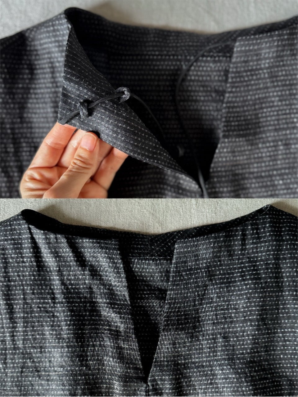 苧麻の軽やかさに加え上質な手織りの上布ならではの奥深いツヤとシャリ感を活かすために手縫いを多用し繊細に仕立てました。
